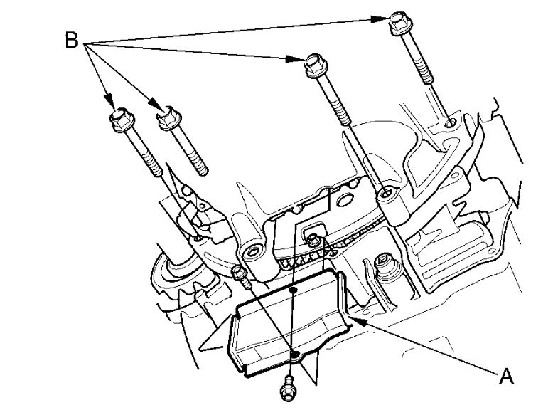 8. Remove the torque converter cover (A) and the four bolts (B) securing the transmission.