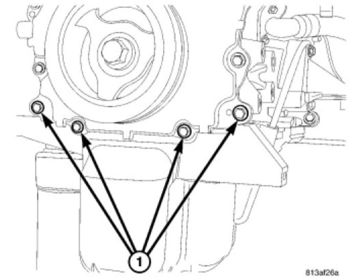 14. Remove lower timing chain cover to oil pan bolts (1).