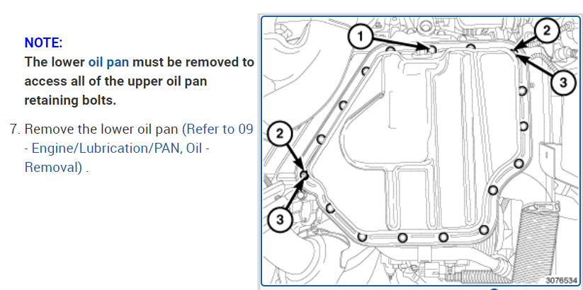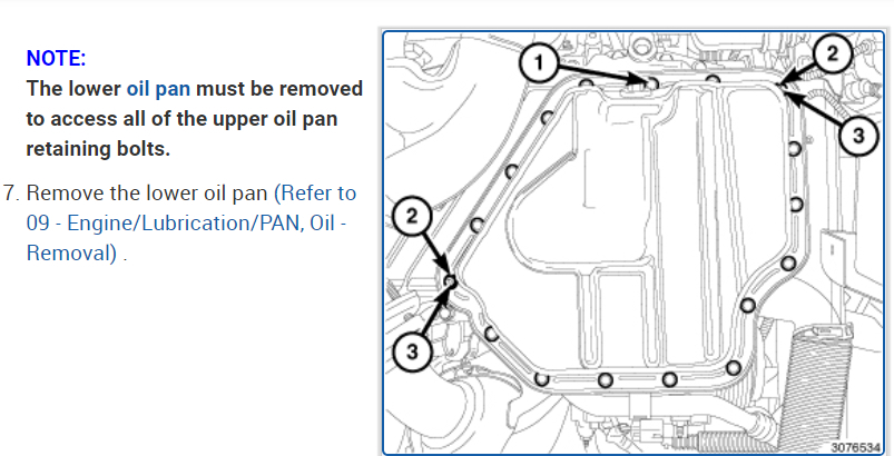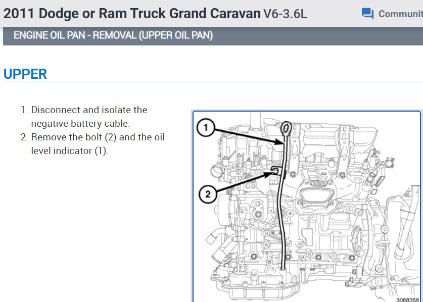 Here is what I found in our repair guides for you. I've attached picture steps below on how to remove and replace both the upper and lower oil pans for your van. Hope this helps and thanks for using 2CarPros.