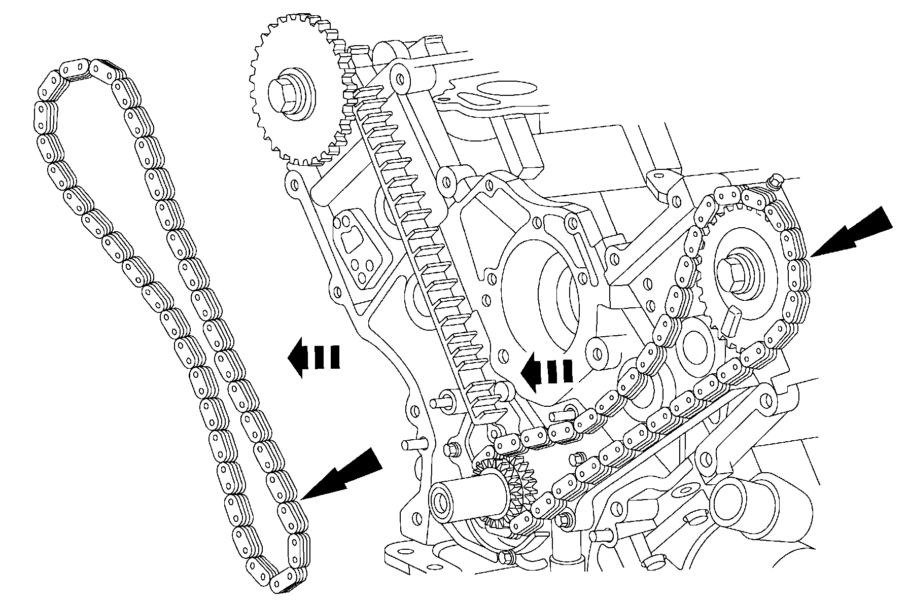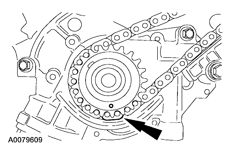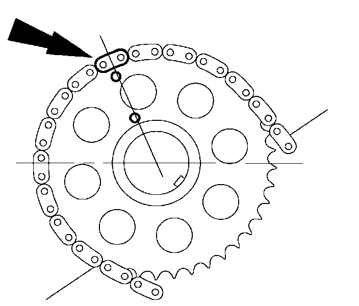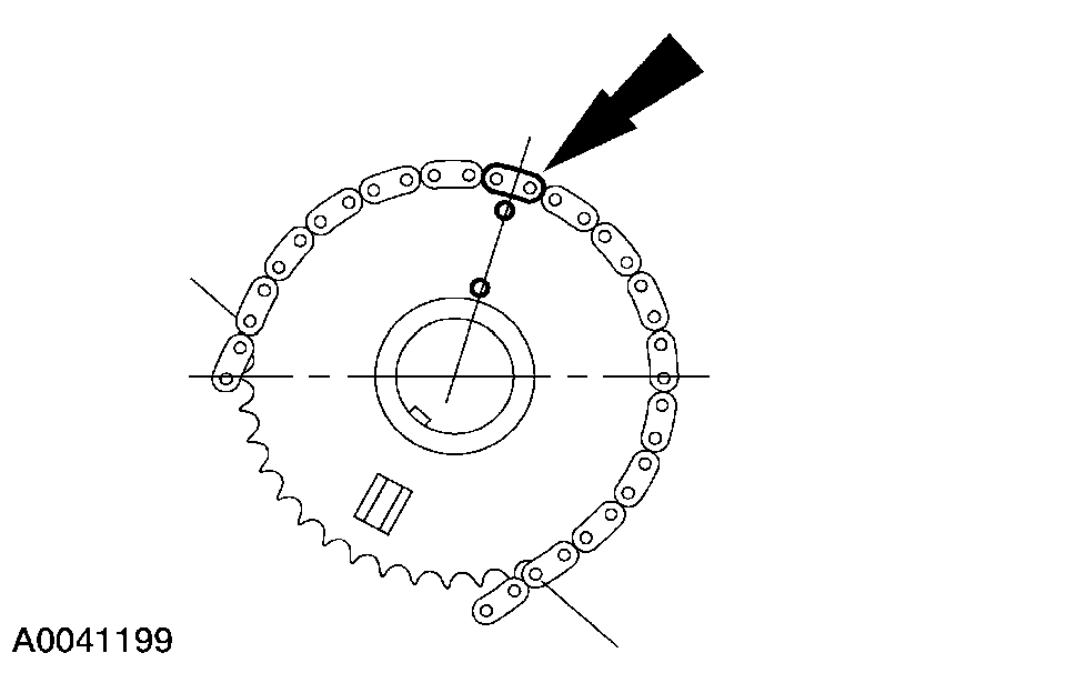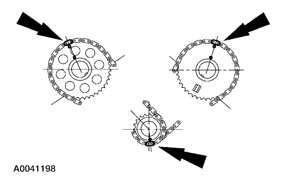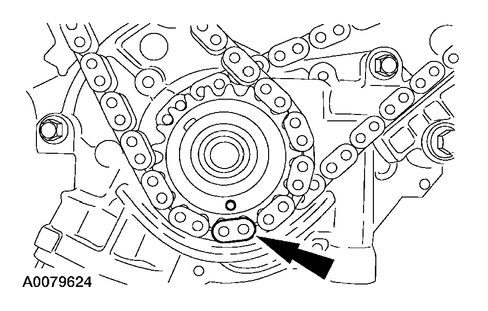 9. Install the LH timing chain on the camshaft sprocket, aligning the copper (marked) link with the timing marks ran the socket.