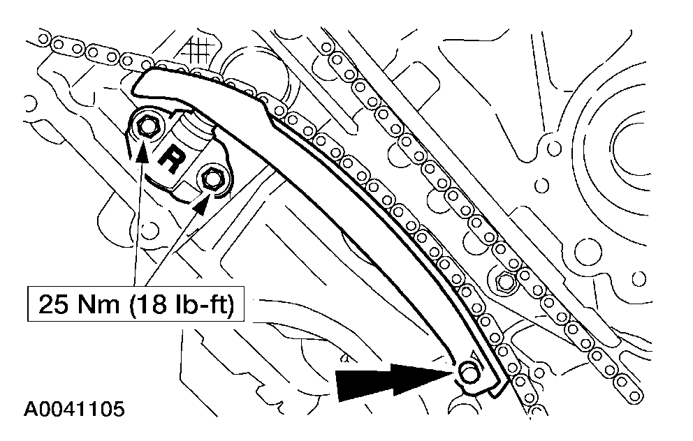 14. Position the RH timing chain tensioner arm on the dowel pin and install the RH timing chain tensioner.