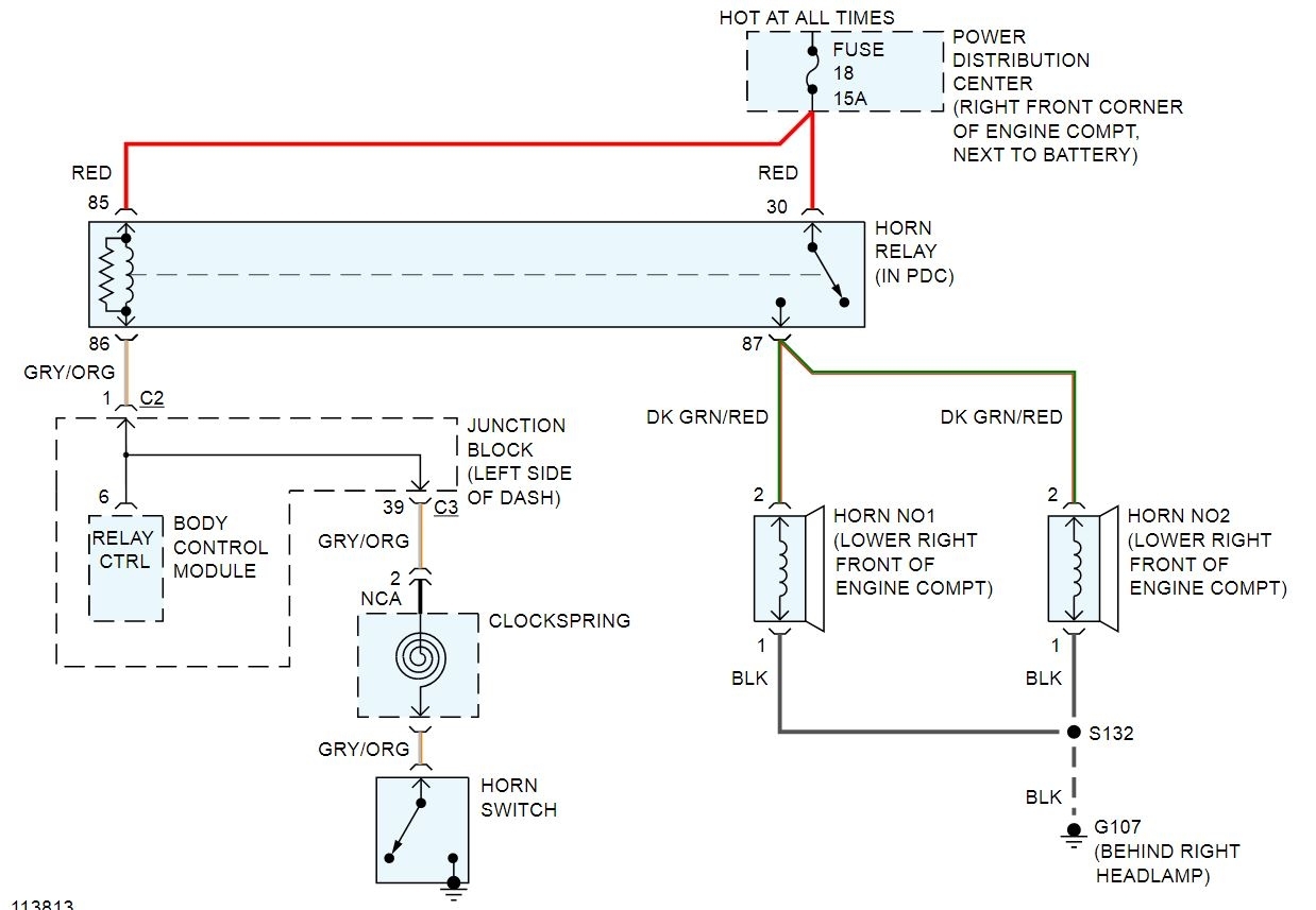 Okay, the first thing we need to discover is if the problem is on the control side or the horn side of the relay. This is easier than you may think. You will need a simple test light. First connect the test light to ground and touch it to the battery positive post to verify it works. Next remove the horn relay and gently touch the test light to the contacts in the socket. It should light up on two of them, those supply power from the battery. Make note of those two points. Now connect the light to the battery positive and use it to touch the other contacts in the relay socket with someone holding the horn button on, If the wiring to the switch through the BCM is good the light should come on, it also should come on if the wiring through the horns to ground is good. A second test for the control side would be to put the relay in and feel and listed for it to click when the horn button is pushed. If you hear and feel it click but no horns then it is the wiring to or the grounds for the horns. A fast way to test that would be to look at the relay, it will have a schematic or numbers for the terminals. Find terminal 87, that is the feed to the horns. If you take a jumper lead just touch it between one of the powered terminals in the socket to terminal 87, if the wiring to and the ground to the horns is good they should blow. If that all checks out but you didn't have anything on terminal 86 with the horn button pushed then you will need to go to the body control module connection on the back of the junction block/fuse panel at the left end of the dash. There you need to find connector 3 and terminal 39 with a gray wire with orange stripe which is the switch feed out of the clock-spring. With the test light connected to power the light should come on when the horn switch is pushed and the light is touched to that terminal. If you touch the contact on the junction box with the test light connected to ground the horns should blow. If all of that checks out then the issue is the clock spring or the horn button or it's ground. To test those is a bit harder as you need to remove the air bag module by removing the two screws that hold it to the steering wheel, then gently pull it out enough to get to the connectors and disconnect them. Now look for the gray with orange wire there, that is the horn connection to the switch. If you take a short jumper and go from that wire to the metal part of the steering wheel the horn should blow if the clock spring is Good, if it does then the switch is the problem. If the horn doesn't blow it's the clock spring. The switch is part of the cover and it grounds through the metal and screws that secure the airbag module. So you could remove the cover and clean the contacts and test that it's grounded if it is the switch.