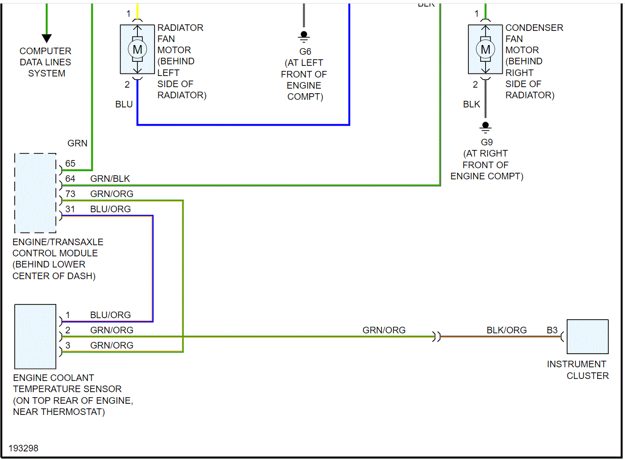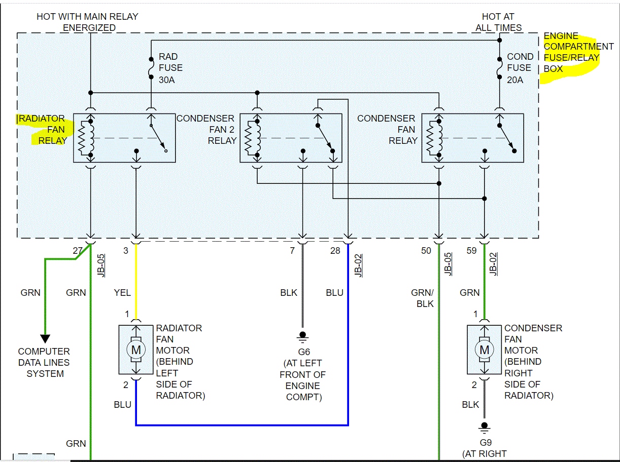 I attached the wiring schematic for the cooling system fans. I had to cut it in half to make it readable for you, but I did overlap the two so you can follow from one to the next.