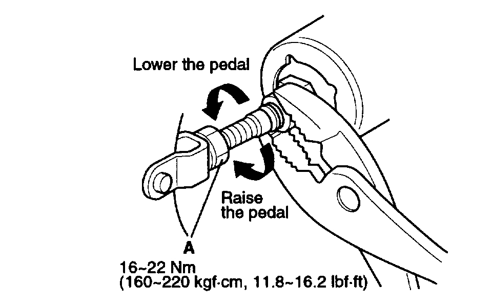 3. Loosen the pushrod locknut (A), and screw the pushrod in or out with pliers until the standard pedal height from the floor is reached. After adjustment, tighten the locknut firmly. Do not adjust the pedal height with the pushrod depressed.