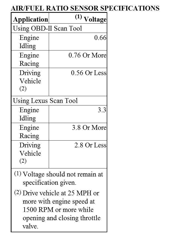 2. Connect scan tool to Data Link Connector (DLC) No. 3. Start engine and raise engine speed to 2500 RPM for approximately 90 seconds. Using scan tool, monitor each A/F sensor output voltage. See AIR/FUEL RATIO SENSOR