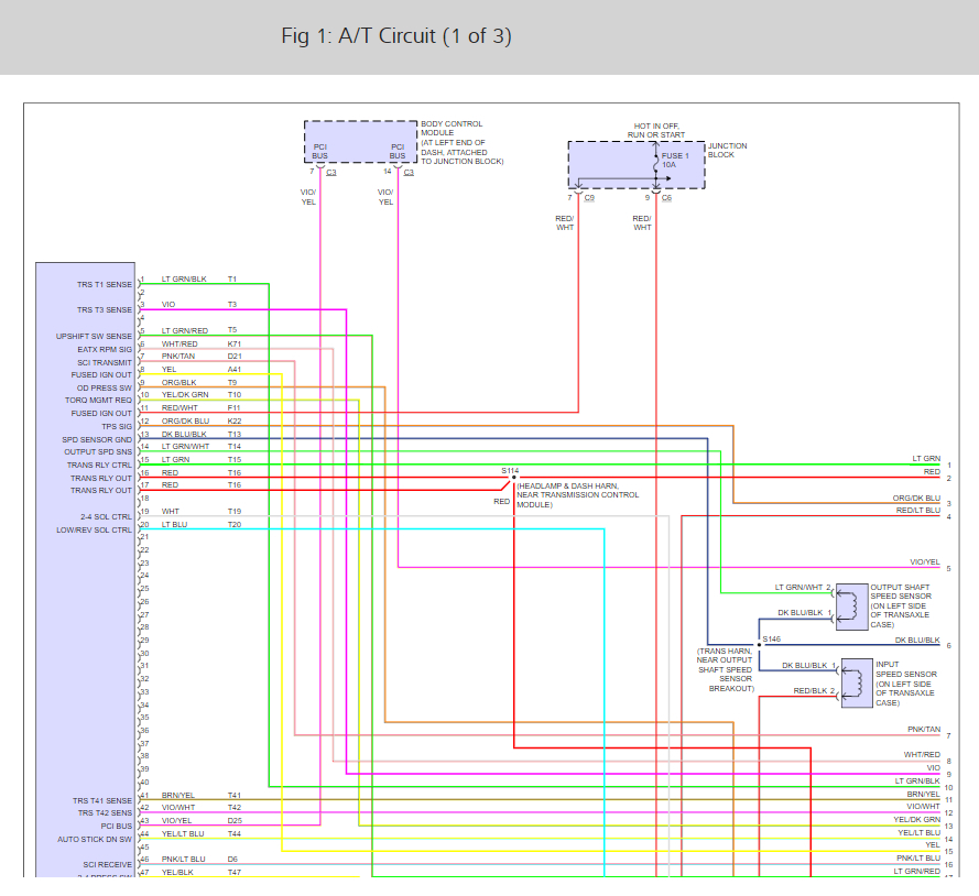 Okay, I did some digging around and came up with a few possible issues. I hope you can read my handwriting in my diagram. That diagram is a connector that comes off the TCM bottom connector, but not directly. Once it gets to the firewall, it splits and this one goes down to the transmission. The two that do not have description and show no voltage are the two speed sensors. I read the diagram and saw that the black/light blue ties in with several other things. The engine temperature sensor happens to be one. The next two pictures are of a component on the intake manifold, just above the thermostat. The last picture is of the plug and wires that go to it. I have no idea what that component is, but I think it is shorting out, and causing my problem. What are your thoughts?