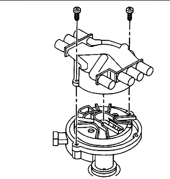 1. If installing a new distributor assembly, place two marks on the new distributor housing in the same location as the two marks on the original housing.