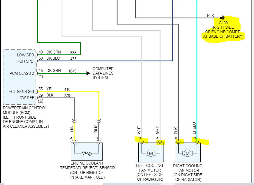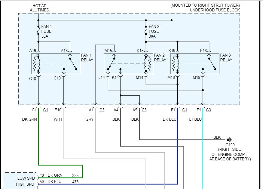 If you look below, I attached the wiring schematic for the circuit. You mentioned checking the 30-amp fuse for the fans. Note there are two 30amp fuses and three relays. If you haven't checked both fuses and the relays, let me know. Also, in addition to checking the fuses, make sure there is power to them.