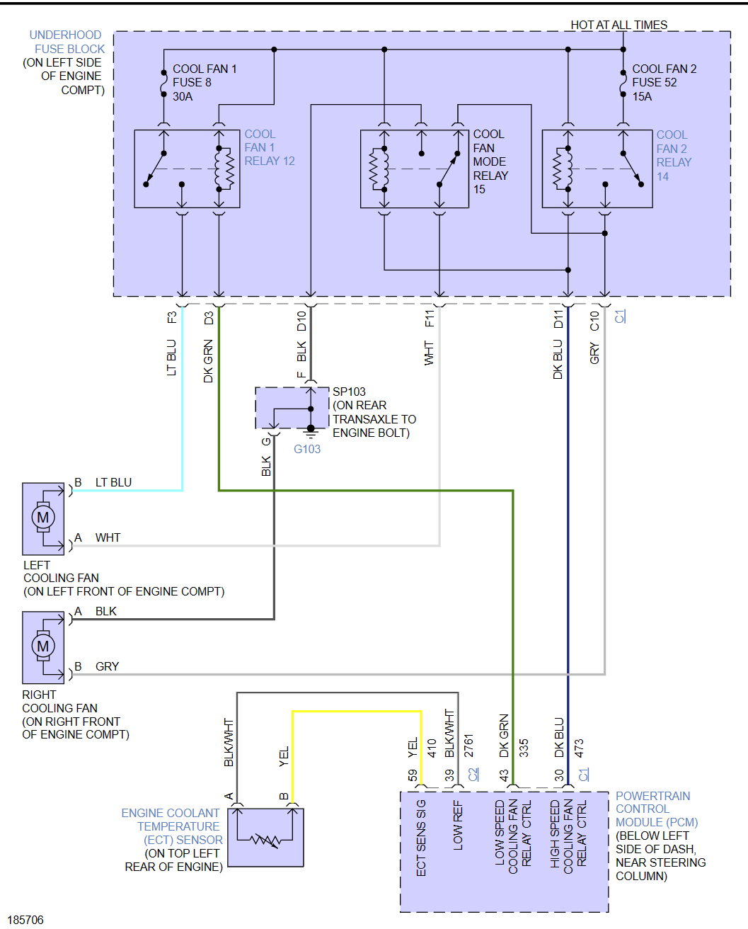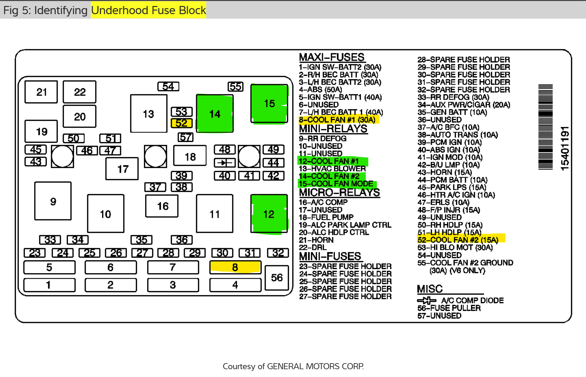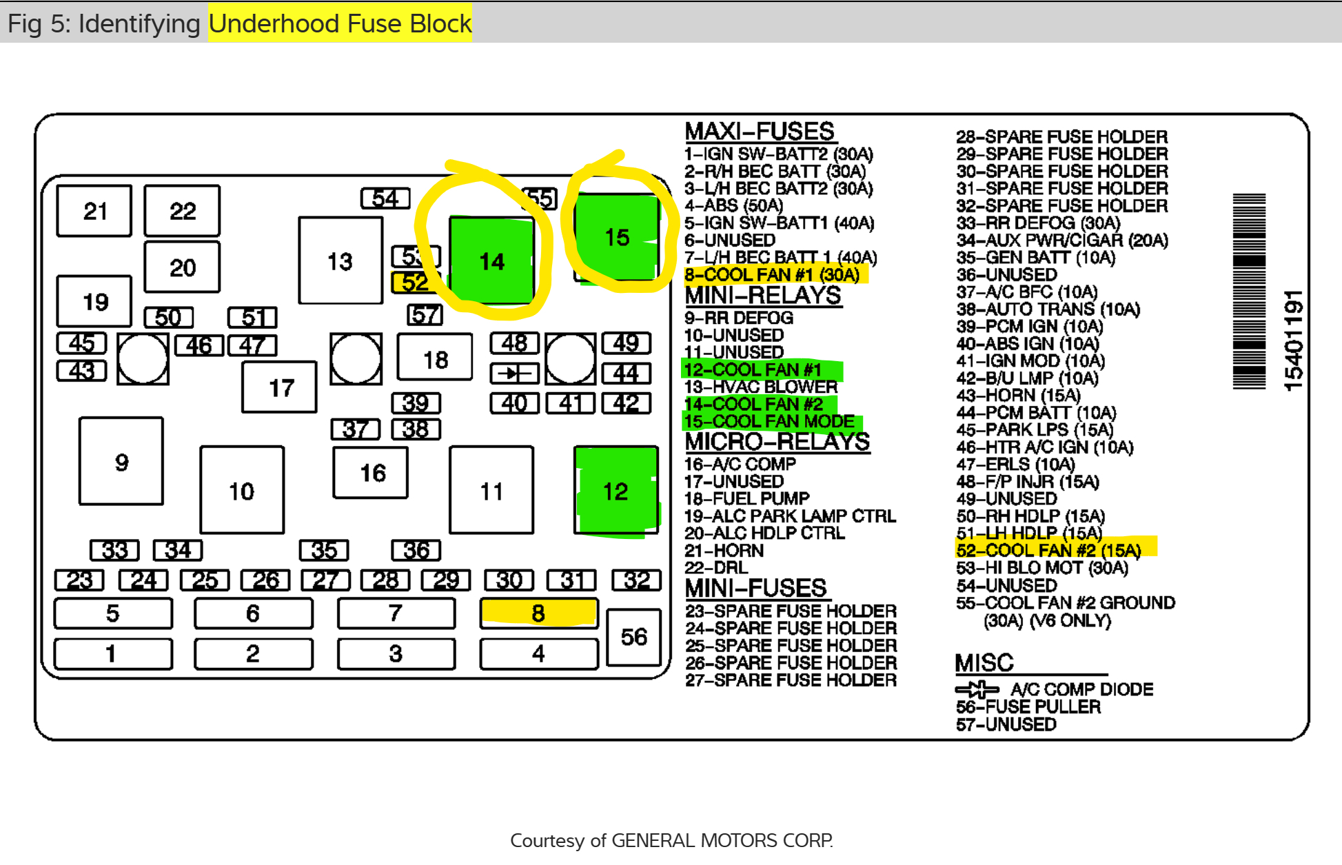 I have included a wiring diagram for the cooling fan circuit as well as a fuse box diagram. There are 2 fuses (marked in yellow) and 3 relays (marked in green).