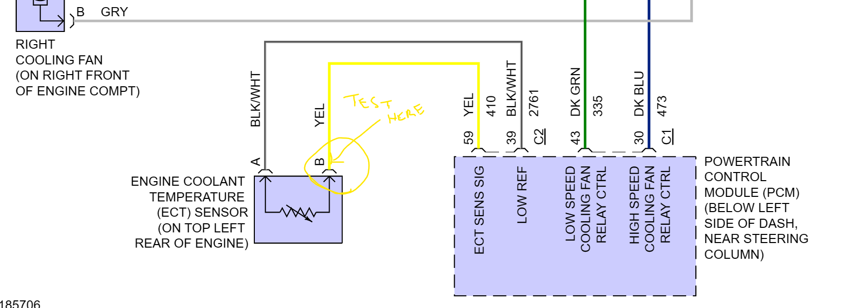 If not, another way is to use a multimeter. There are 2 wires coming out of the ECT Sensor. The yellow wire is the signal wire that is being sent to the PCM. We want to measure the voltage on the wire. I have attached a wiring diagram for you.