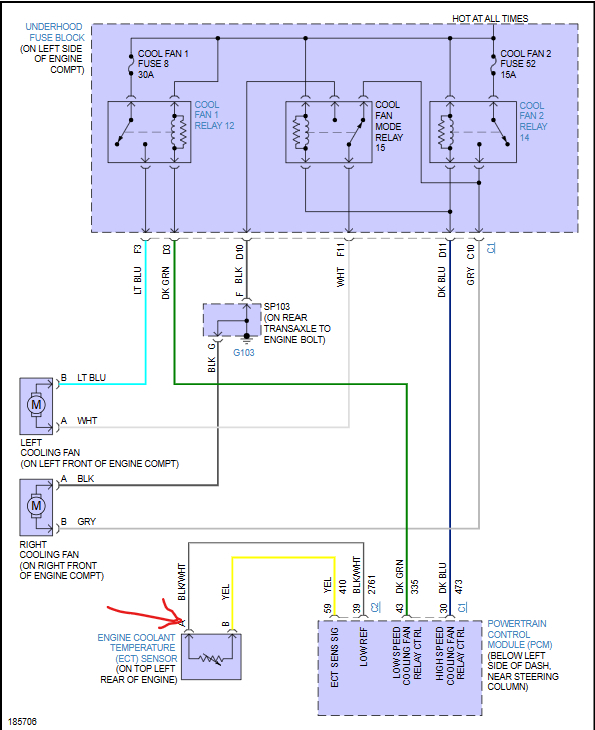 I have added part of a wiring diagram for the cooling fan circuit. It shows the ECT or Engine Coolant Temperature Sensor. It should be located on the top left (driver's side) rear of the engine.