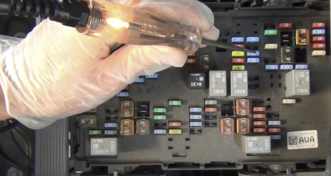 I would also double check fuses really quick because we have been testing, unplugging and plugging back in things, we want to make sure we didn't pop anything. You can just use you meter for this, you should have 12 volts on each side of the fuses. A test light will work well also. Whichever one you use both will use battery for ground.