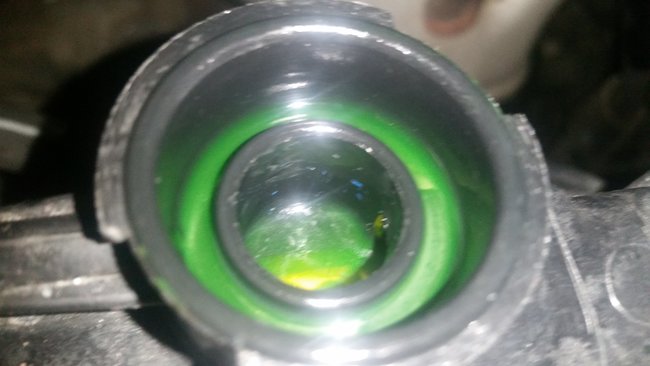 I was referring to the radiator itself. I fill it up to the filler neck, and the pressure from the system shoots some of the coolant up into the rim around the cap area. I was thinking maybe with such a small amount in there, it could get really heated up to the point of evaporating. I also noticed the sticker on the radiator cap was rather damp. It did rain tonight but nothing else was wet in that general area, so it seems to have come from out of the radiator itself. I switched back in the old radiator cap, but noticed the sticker on that is completely worn out. So it may have had the same thing happening. I've attached pictures.