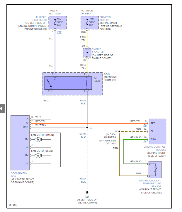 I have also included the wiring diagrams for the cooling fans so you can see how the system works and which fuses to test. Check out the diagrams (below). Let us know what happens and please upload pictures or videos of the problem.