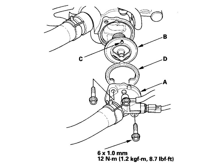 7. Face the pin (C) toward the upside, install the thermostat with new rubber seal (D).