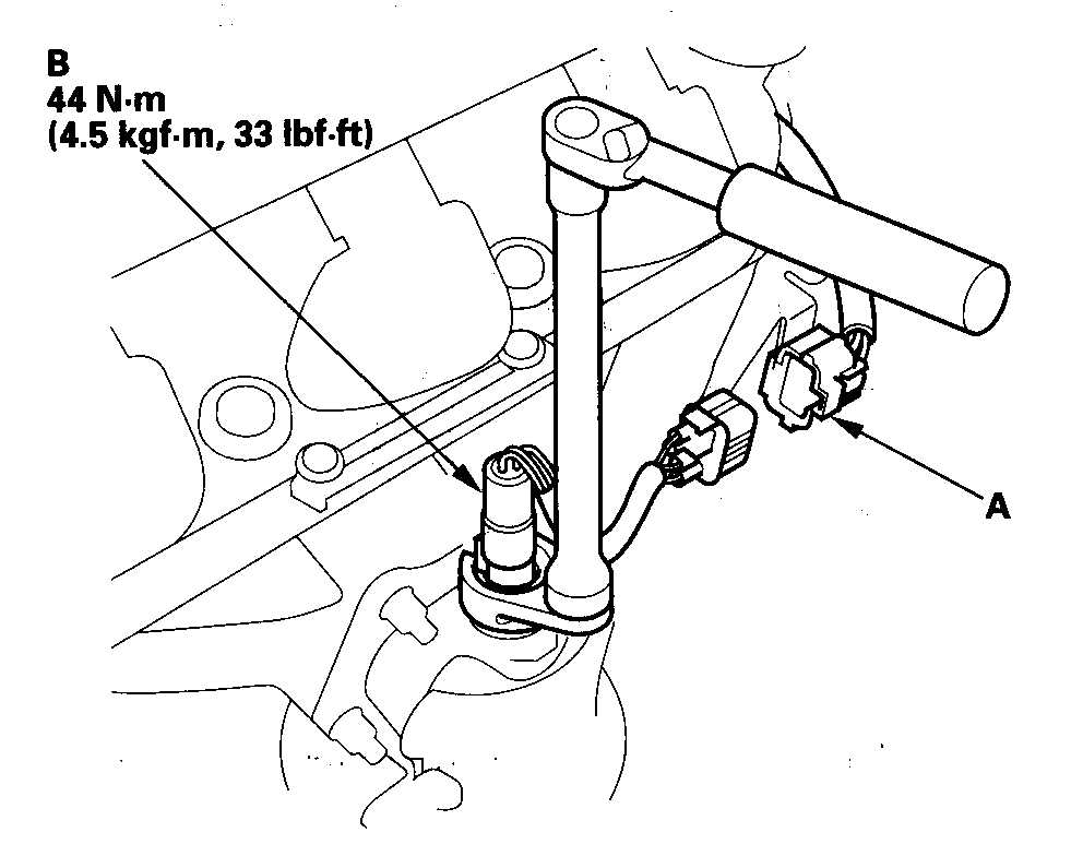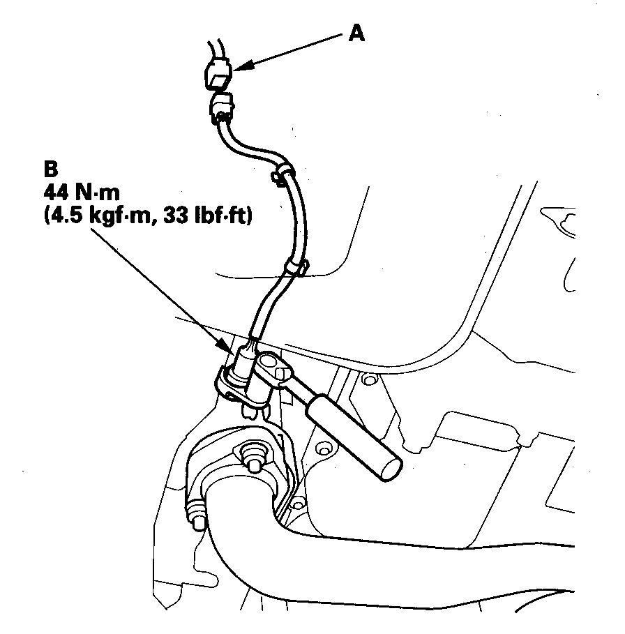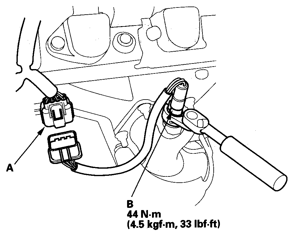 1. Disconnect the rear secondary HO2S4P connector (A), then remove the rear secondary HO2S (B).