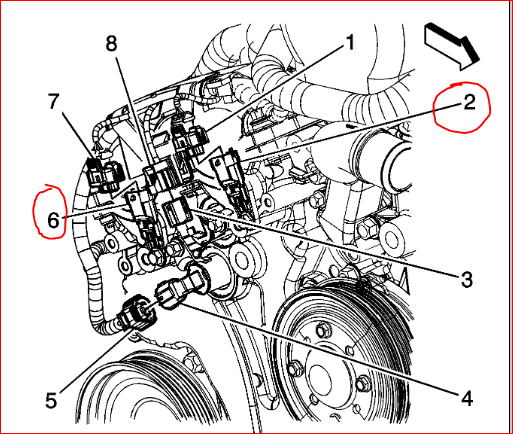 I've attached a picture below of its location. I've circled in red the location #6 is the bank 1 exhaust camshaft sensor and #2 is the bank 1 intake sensor. Here is a tutorial showing what is involved in the replacement: