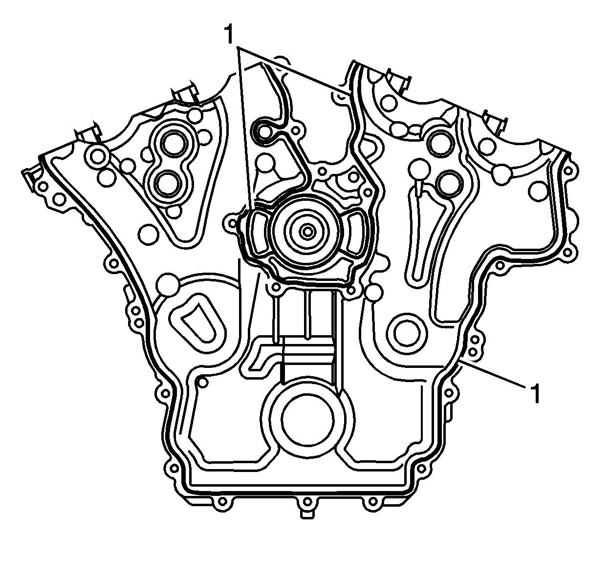 3. Place a 3 mm (0.118 in) bead of RTV sealant, GM P/N 12378521 (Canadian P/N 88901148) or equivalent, on the engine front cover as shown (1).