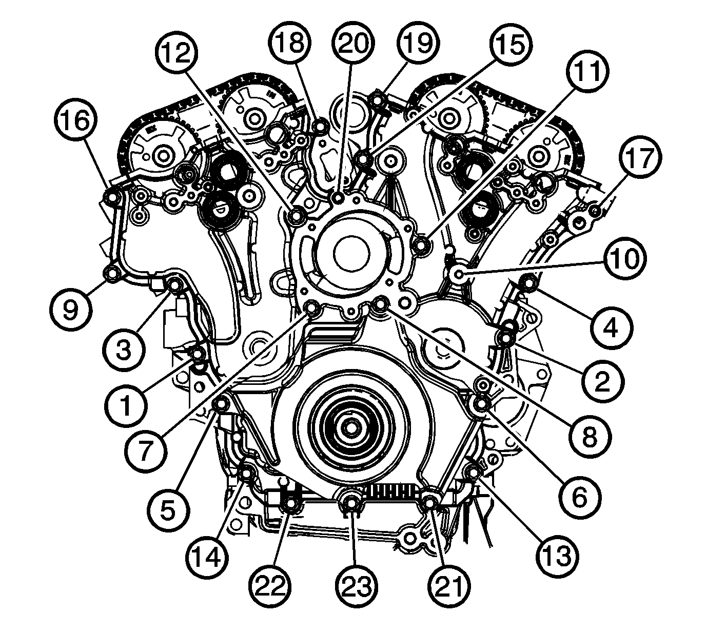 Tighten the engine front cover bolts in the sequence to 23 N.m (17 lb ft).
