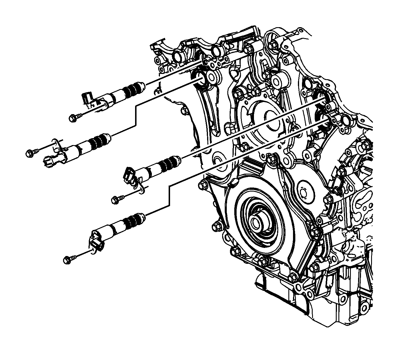 10. Place the camshaft position actuator valves in position on the front cover.