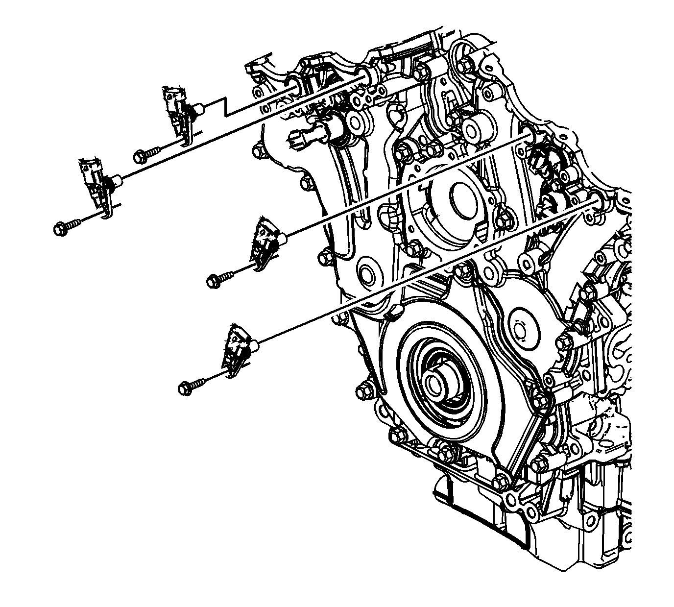 13. Place the camshaft position sensors in position on the front cover.