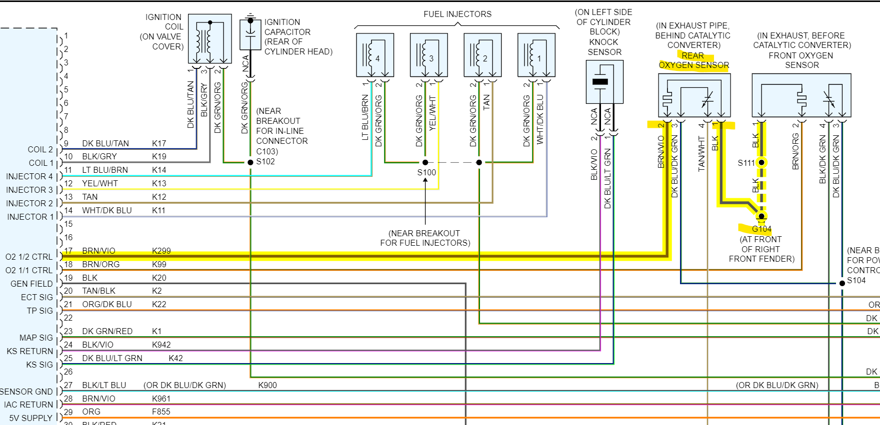 It looks like the ECM is under the air filter housing, but some of these diagrams can be incorrect. But I think you will find either a broken power feed or Ground to the rear Oxygen sensor. The Ground itself is supposed to be shared with the front Oxygen sensor heater, so hopefully it is just a broken wire.