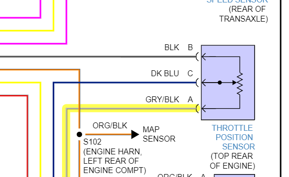 Hey, I went back to the fire wall and couldn't see or feel anything, under the dash the ECM connector has a screw in the middle that is held in place by a washer. That keeps the parts from separating and I couldn't push it out. At any rate, I decided to redo some test starting from the beginning with back probing the TPS sensor connection on the wire side. grey/black read good 5.00 black read 0.01 blue read 0.01 and when I pressed on the throttle nothing happened at all. I tried different placement of pins, different pins and different grounds and the readings remained consistent. there wasn't movement.