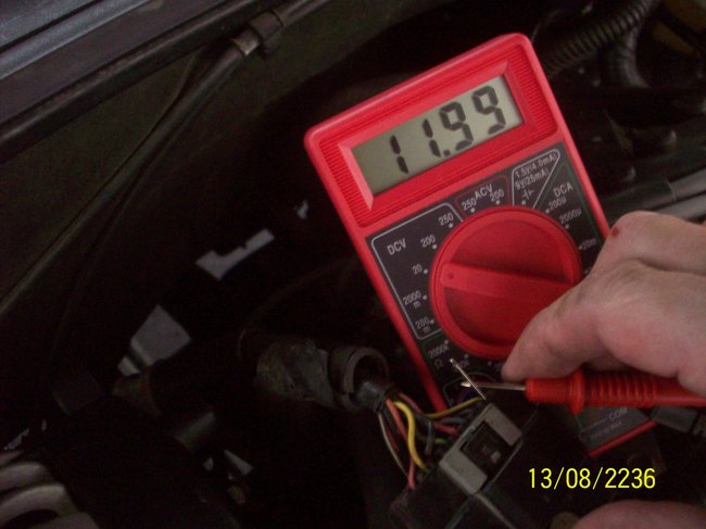 back probing blu wire car running multimeter reading 1.60 - 1.62. If I press on throttle it topped out at 4.53 but was bouncing around a lot. 4.53 to maybe a 4.49 it was hard to get a good read and that was with my black wire on the battery negative.