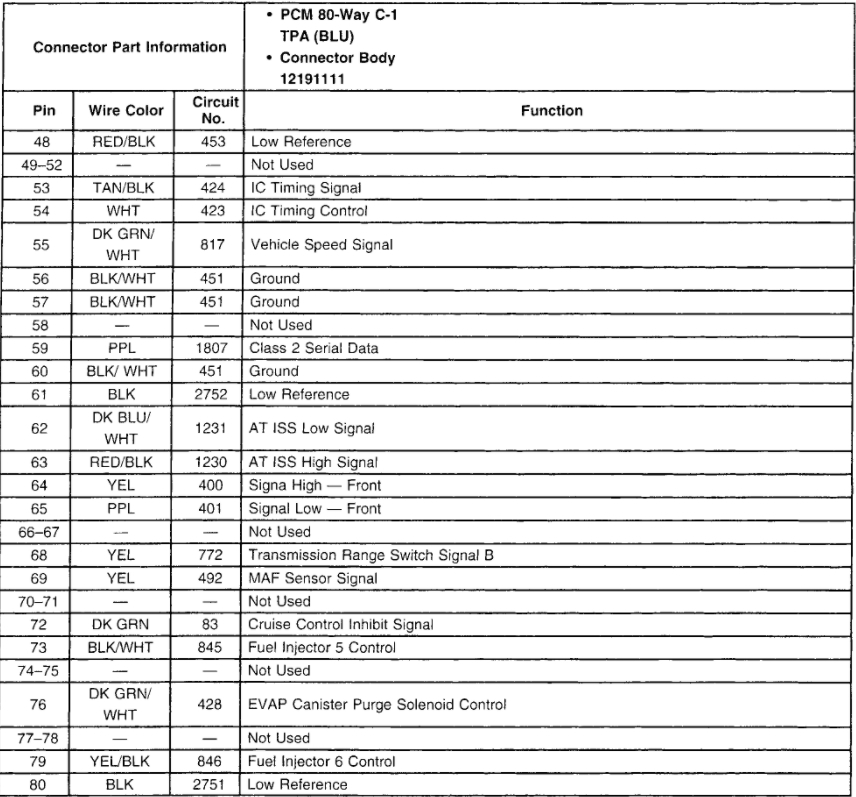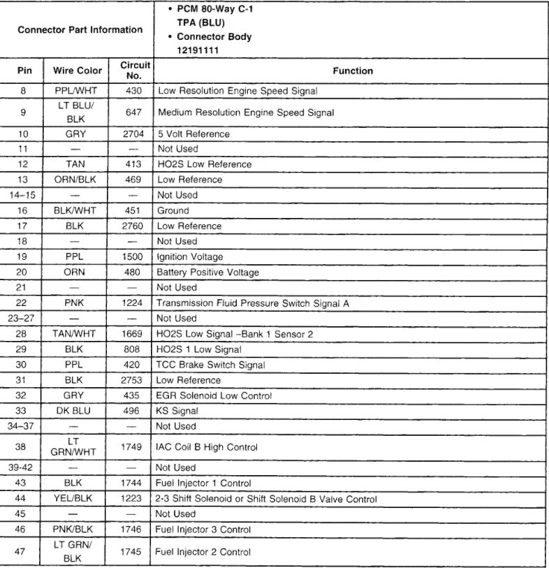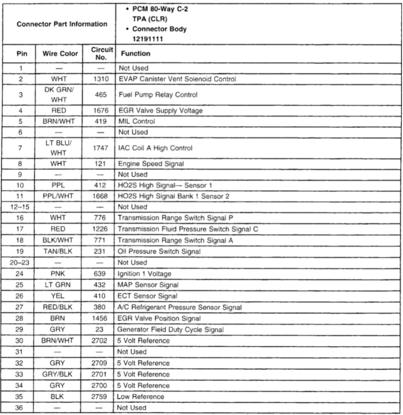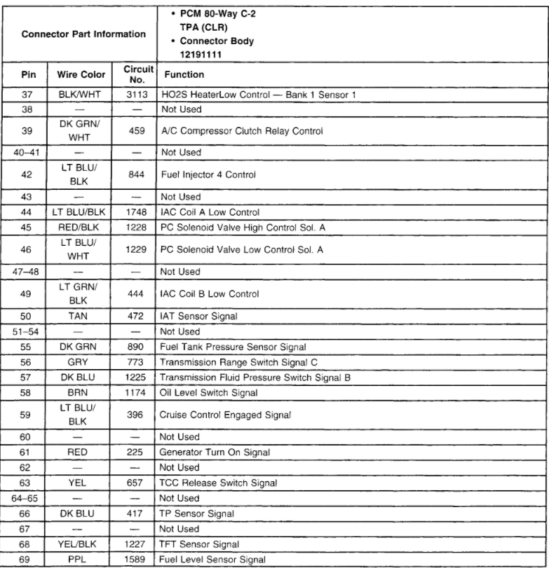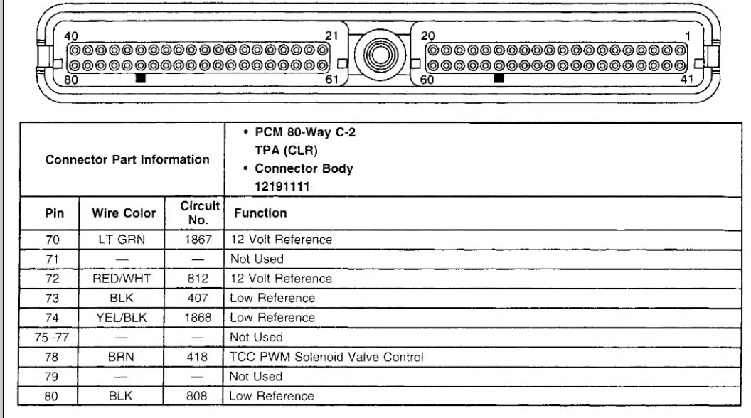 It took a while but here's what I got on the connections from the connection side. I couldn't go in from the wire side because it's all encased in plastic and I couldn't get in there, I didn't want to break it trying to separate the halves. C-1 pin 20 battery positive voltage 12.34, pin 19 ignition voltage 12.03, pin 16 ground -0.02. C-2 pin 66 T P Sensor signal 0.01 and the battery is down to 12.19 now. C - 2 was harder because the wires didn't have much give to turn and being clear reflected more light back. What I saw that I think would be off is maybe c-1 pin 16 my .signal wire -0.02 and on c-2 pin 66 my TPS signal 0.02. What that all means though I'm not sure. One thing I didn't think of doing when I was on 16 was press on the gas pedal and take that reading. I was trying to keep a good ground.