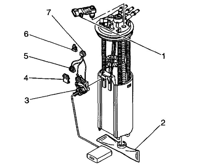 7. Support the fuel sender assembly with one hand and grasp the strainer (2) with the other hand.