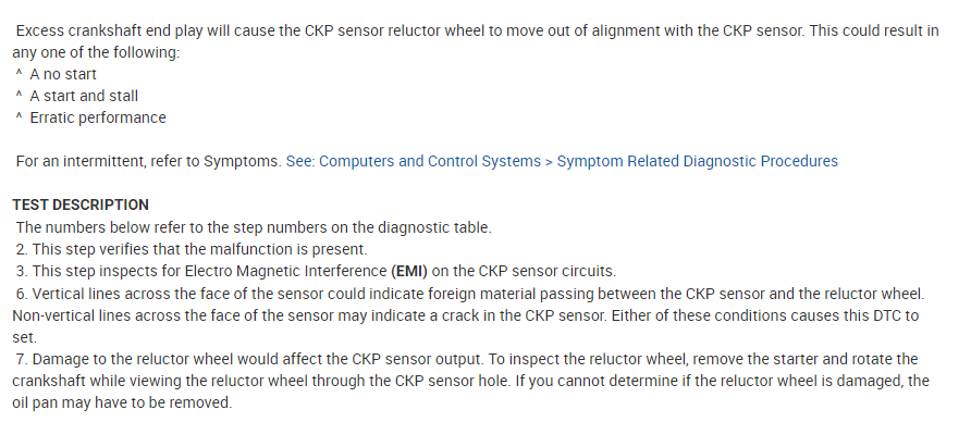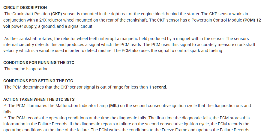 Okay, today I once again went while the basic steps from checking on the scanner to see that it still showed the CPK was malfunctioning or that it possibly was touching the reluctor wheel. I also checked different points of ground at the rear of the motor to the firewall and also at the front of the motor to the battery. Upon checking the spark plugs and wires I decided to test the coils 1 by 1 for each cylinder I noticed that on the driver's side the 1st 2 cylinders had no spark the 3rd cylinder had intermitted spark in the last cylinder had no spark I ran out of time before got dark so I couldn't check the passenger side but when I would place a screwdriver close to the engine block and the coil the motor seem to almost start the motor seem to almost start... Now I may be wrong but I am assuming that it could possibly be a ground issue?