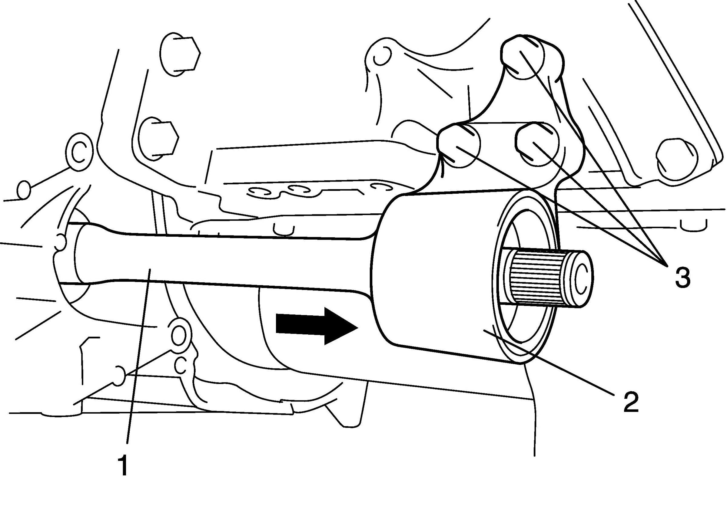 4. Remove center bearing support bolts (3) and remove center bearing support (2) with center shaft (1) from differential side gear (for 2WD vehicle).