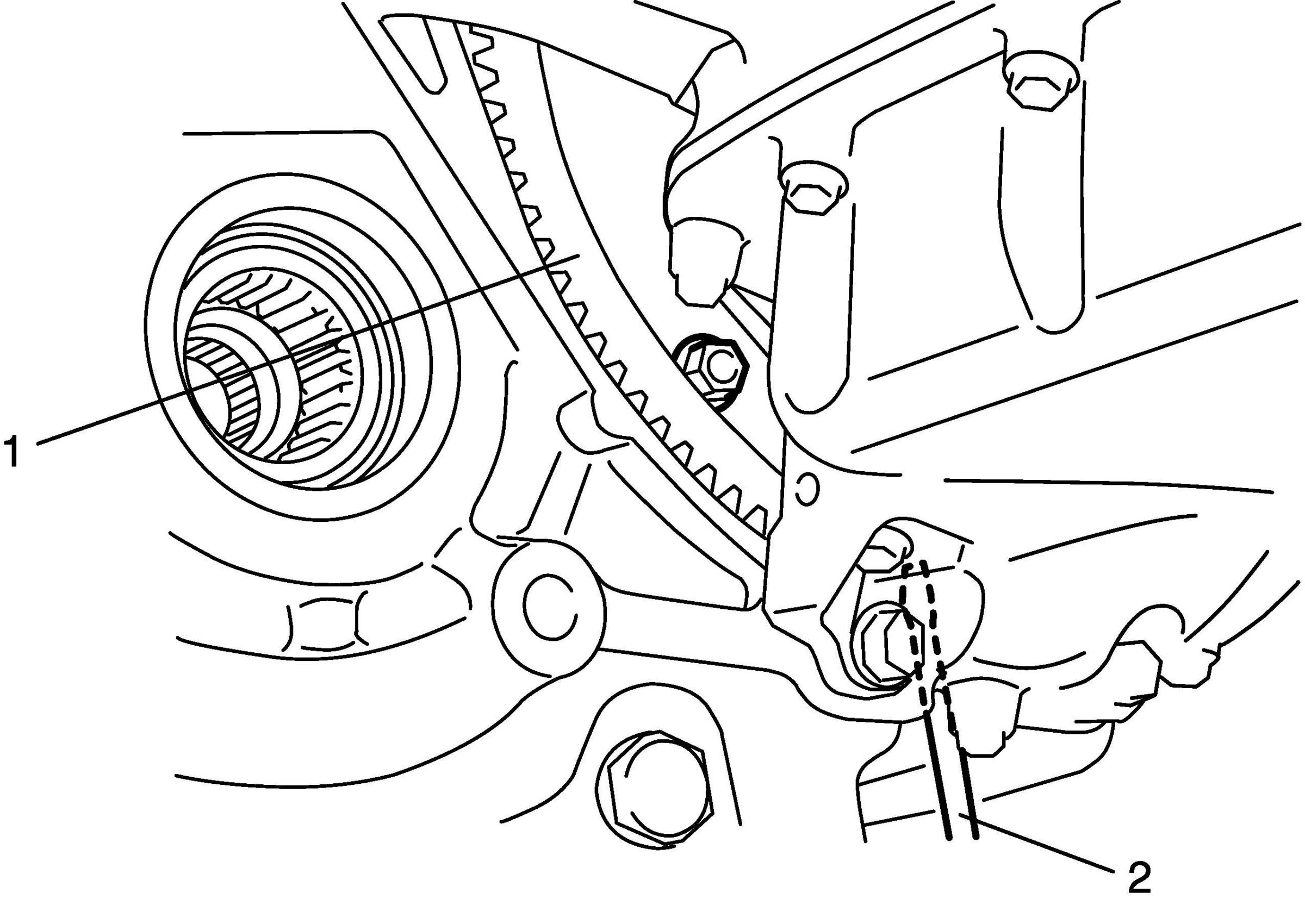 4. Remove CKP sensor (1) from cylinder block (2).