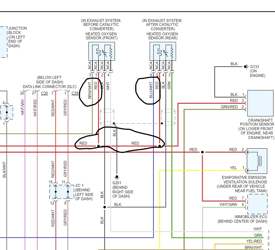 P0135 would be a heater circuit code for the upstream sensor. It is set when the ECM decides that it's taking too long for the sensor to heat up from the heating element inside it and start switching. It does that by checking the current and sets the code if the heater current continued to be lower than 0.2 ampere or higher than 3.5 ampere for 6 seconds. The sensing part is still working so on the scan tool it will look normal. I don't think that system has the bi-directional ability to turn the O2 heaters on and off to make testing easier. The way it works is simple, the red wire should have battery power with the key on. This same power feeds the crank and a couple other sensors so it should be okay, the brown with white stripe wire is the control wire from the ECM, it grounds to turn the heater on. Same thing happens on the blue with white wire on the downstream sensor.