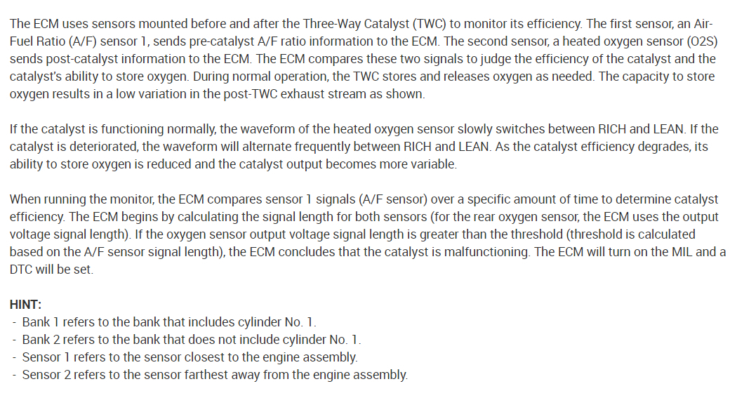 Hello, I did some intense diagnosis and have more information for you. Every time I go on a small road trip more than 50 miles, my check engine light would come on. I used my scanner to see live data and noticed that bank 2 sensor 2 which is after the catalytic converter by the engine was fluctuating the voltage quite a bit. And once in a while it would go to 0.0 volts when I let go of the accelerator pedal. As you have said, I don t see any symptoms of a failing catalytic converter because even when the check engine light is on the car still has full power and don t feel a loss of power. Bank 2 sensor 1 doesn t fluctuate a lot and is steady. I have attached 2 videos of showing the operation of the sensor and you can see sensor 2 showing 0.000 volts when I was cruising at 45 MPH.