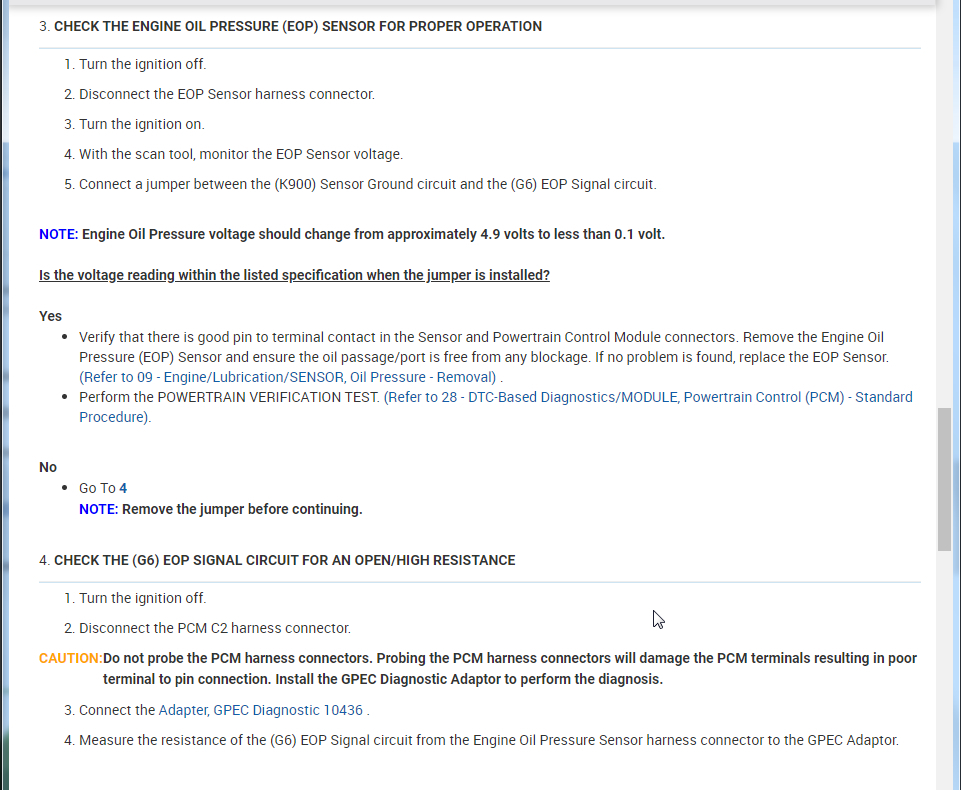 Measure the resistance of the (K900) Sensor Ground circuit from the EOP Sensor harness connector to the GPEC Adaptor.