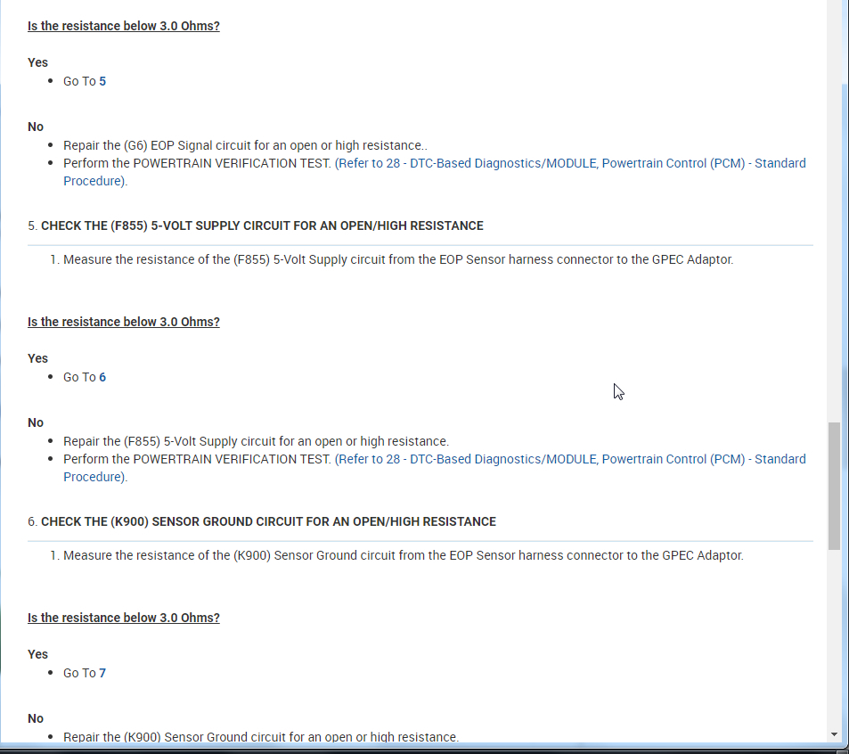 Measure the resistance of the (F855) 5-Volt Supply circuit from the EOP Sensor harness connector to the GPEC Adaptor.
