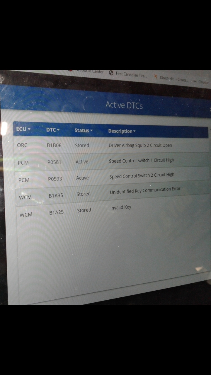 The first code is b1b06 (status/stored)-driver airbag squib 2 circuit high. The next code is p0581(status/active)-speed control switch 1 circuit high and the 3rd code is p0593 (status/active)-speed control switch 2 circuit high. I attached a picture, not sure why you couldn't see the b1b06 code? But it's there with the other 2.