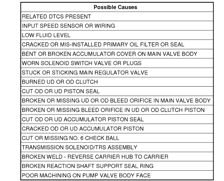 If the ratio of the Input rpm to the Output rpm does not match the current gear ratio. This DTC can take up to five minutes of problem identification before illuminating the MIL