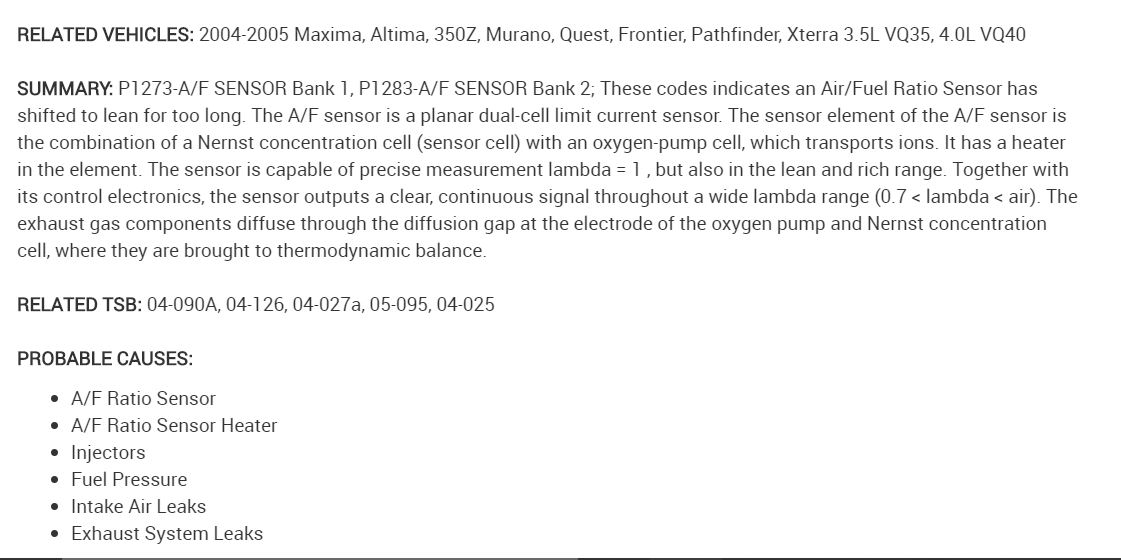 I am having trouble diagnosing a p1283 code on my vehicle listed above. I have replaced both upstream sensors.There no obvious exhaust leaks I have done all the diagnosing as described in the factory service manual (FSM) so there is no shorted or open wires in the harness.Also I have done the accelerator pedal position re-learn, throttle valve closed position re-learn, idle air volume re-learn and the air fuel ratio reset that are all listed in the FSM. After all this I am still getting the code. This is after swapping in a used engine that had approximately 67,000 miles on it. I replaced all the gaskets from the heads up and installed new primary catalytic converters.
