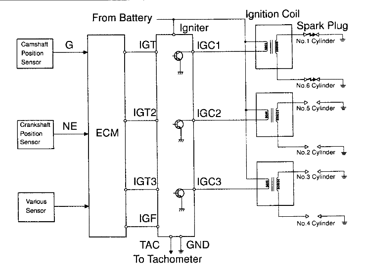 Hi Danny, I was able to verify IGF voltage at 5 volts measured at the IGF connection point on the ignition harness. I went to measure the IGT, IGT2 and ICT3 and could not crank the engine. With the ignition switch on, battery voltage was dropping to 5 volts measured at the battery terminals. When the ignition was switched off, the voltage jumps back up. There seems to be a good short somewhere, maybe the key switch? I don’t think coils are a problem, the coil packs are only 3 or 4 months old.