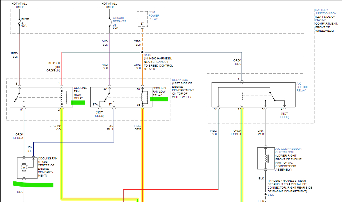 The engine computer controls the two ground circuits you checked. I'm assuming you want to get your air conditioning working. So, I would have that fixed so you have a/c, then the fan will definitely come on with the a/c working correctly. It will most likely take care of that code as well.