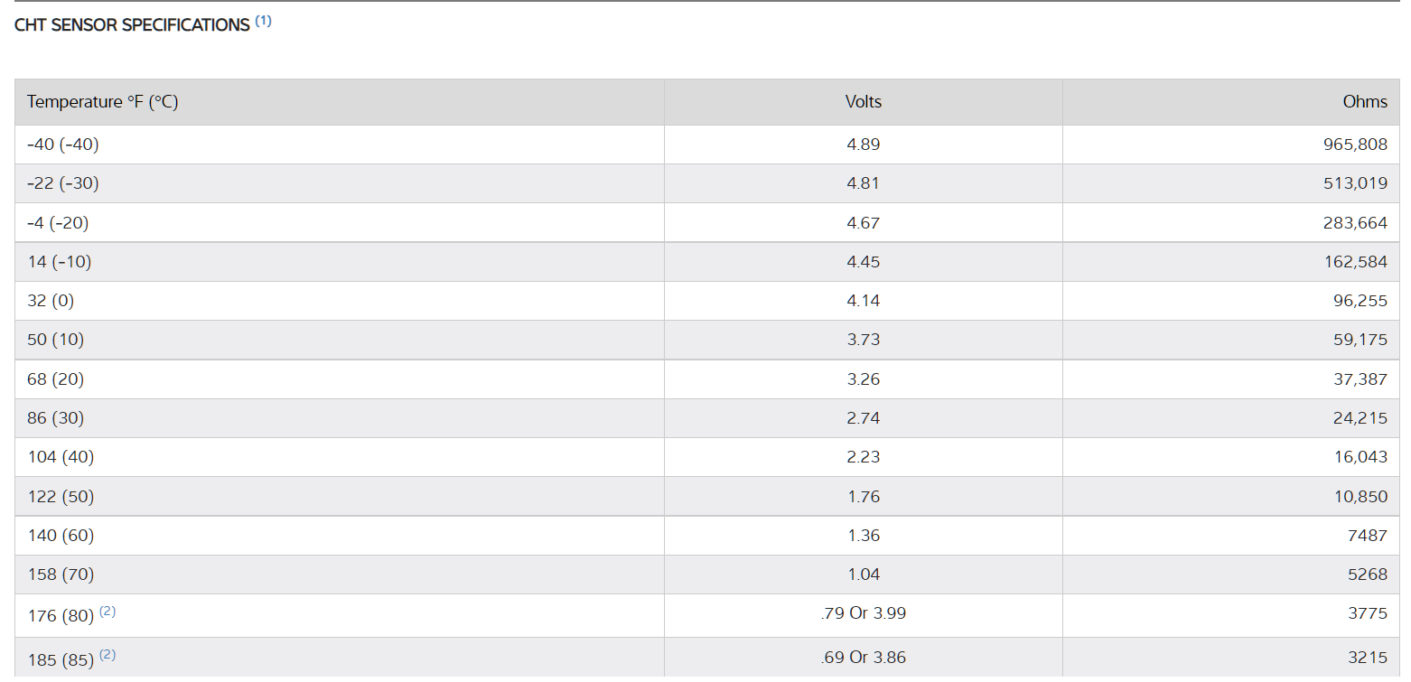 Below is the chart to check the resistance of the Cylinder Head Temperature sensor (CHT). You'll notice as the temperature goes up the resistance of the sensor goes down.