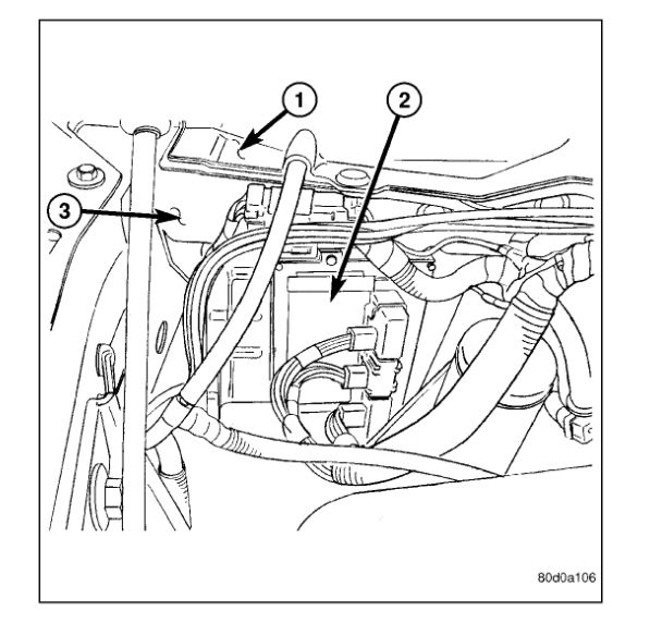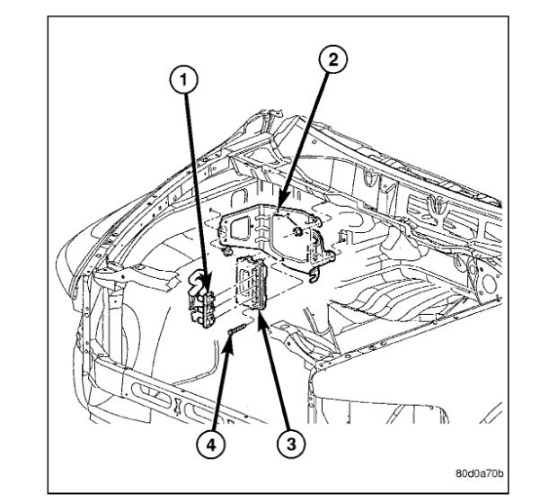 The PCM (1) is located in the engine compartment attached to the dash panel (3).