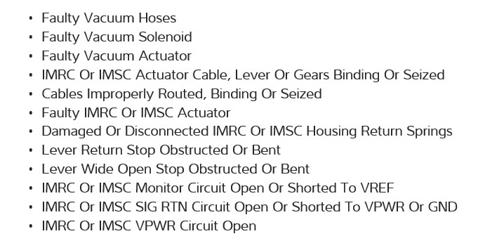 I posted this yesterday and I have checked the actuator with vacuum and it held. I know it is not vacuum and I know its not the solenoids, because I have switched them. Right now I have the IMTV connection plugged into the IMRC solenoid and it is working the flappers, but I still have the code the IMRC solenoid just isn't letting vacuum through when plugged into its connection. Maybe the position sensor. I don't have the money to take this for a diagnostic and my tags are due in six months. Maybe the IMRC signal circuit is shorted to PWR, GND, or SIG RTN, but I don't know how to check that, could some one explain how I would do that procedure? Maybe walk me through it? I would be very grateful.