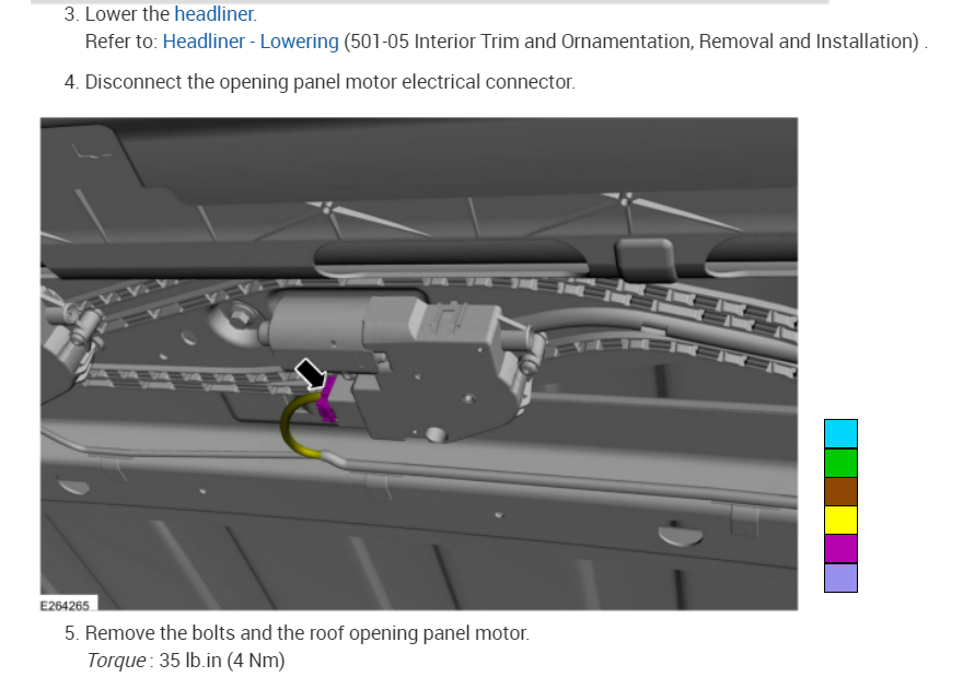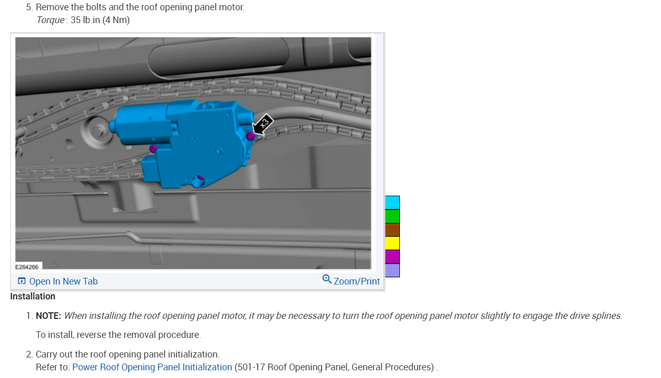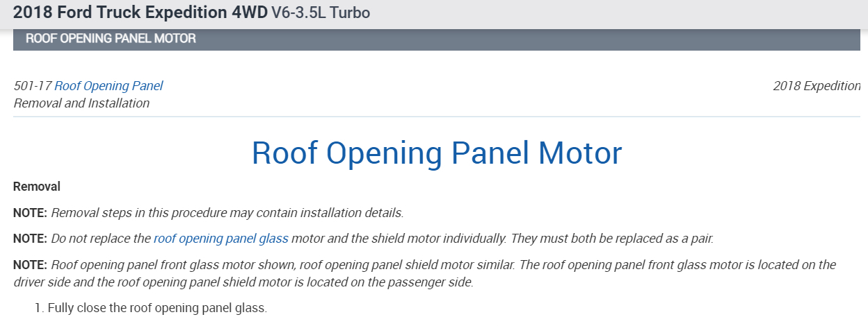 NOTE: The roof opening panel motor must be initialized when repairs are carried out on the roof opening panel system, including: any time the roof opening panel motor has been removed, the roof opening panel glass (fixed panoramic or front sliding) has been removed or adjusted, or if the roof opening panel frame has been removed.