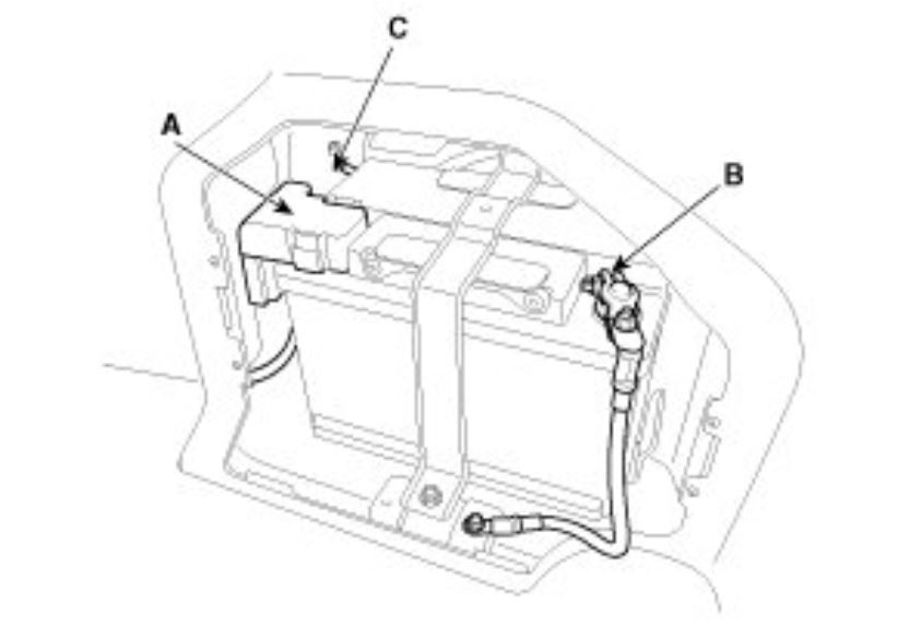 1. Disconnect the battery negative terminal (B) first, then the positive terminal (A).