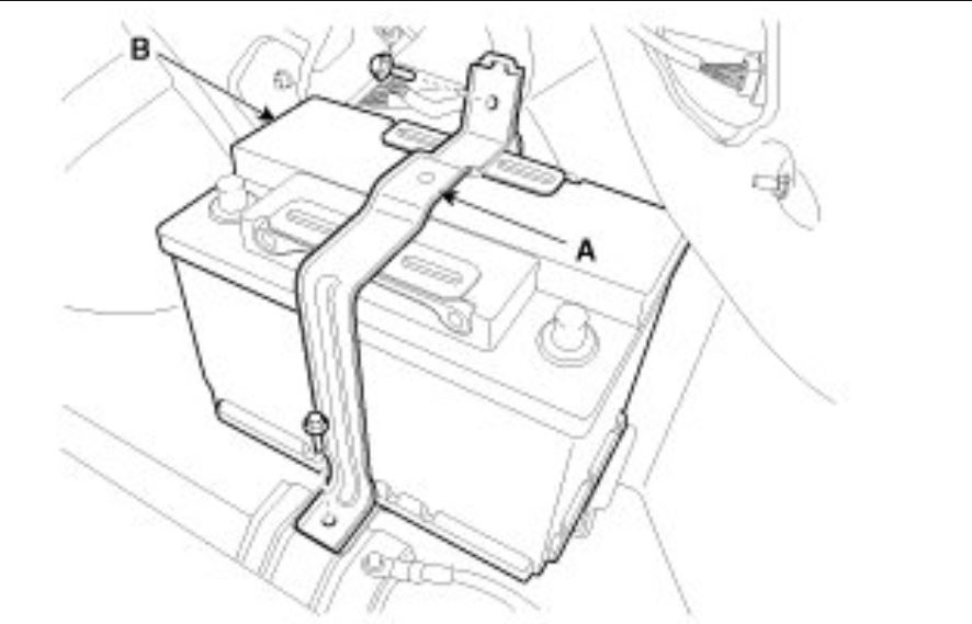 3. Remove the battery upper bracket (A) and then remove the auxiliary 12V battery (B).