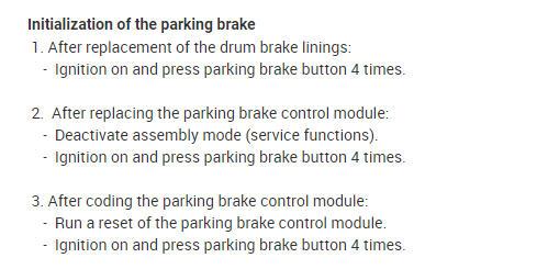 Here is the process from the manual on how this works and how to do the initialization process. Let's try that and see if it makes an improvement. Basically just press the parking brake button 4 times with the ignition in the on position but the engine off.