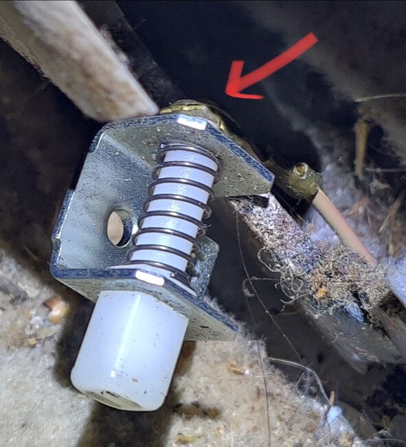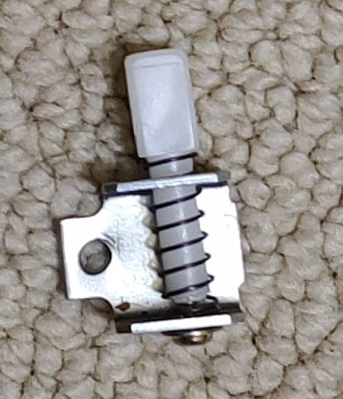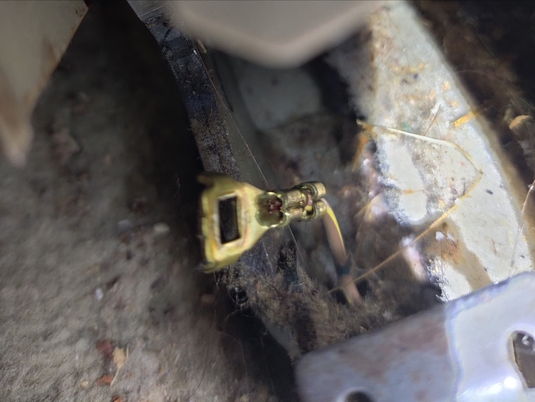 The switch has a wire with a spade terminal attached to it by a screw. From what I can tell, when the white button on the switch is pushed down, the spade terminal should not touch the metal bracket, breaking the circuit and turning the light off. Since the light remains on, it seems the problem isn’t with the switch itself but with something else along the wiring.